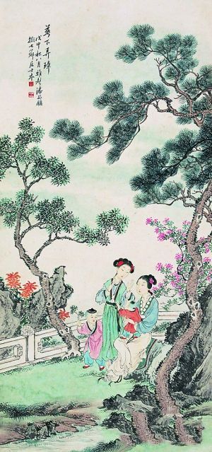 这幅《花下弄璋》(见图),设色纸本,系潘振镛仕女画的代表作之一。纵106厘米,横50厘米。上有题识:“花下弄璋。戊申秋八月,雅声潘振镛,拟七芗 居士本。”钤印“潘振镛印(白文)”、“雅声(朱文)”此画描绘富家庭院一角,曲院香径,松枝纷披,红花绿叶下,两位清秀的仕女一主一仆,倚树而憩,仆从 在旁跟随一孩童,女主人手抱婴儿,正在给他玩弄玉器。古代富人之妇生下男孩子把璋(一种玉器)给他玩,后来把生下男孩子就称为“弄璋之喜”,而生女孩子叫 “弄瓦之喜”。男孩弄璋、女孩弄瓦,实为重男轻女的说法。鲁迅先生曾揭露和批判过这种重男轻女的做法:生个儿子,便当作宝贝,放在床上,给他穿上好衣裳, 手里拿块玉(璋)玩玩;生个女儿,便只能丢在地上,给她一片瓦(纺砖)弄弄。图中仕女造型为清代常见典型画风,鹅蛋形脸,细眉凤眼,樱桃红唇,削肩柳腰, 亦是当时文人理想中的美女形象。背景设置尤具匠心,青松苍石,绿地茵茵,辅衬人物的娇柔妩媚,全图景色优美,层次丰富,意境清雅,用笔精巧,设色淡雅清丽。人物以游丝描绘法,将眉目、发髻及服饰花纹勾勒得十分精细,挺劲流畅,柔中寓刚,足见画家的高超艺技非同一般。