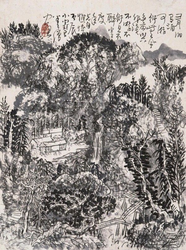 黄秋园《山居听泉》作品介绍:纸本,立轴,水墨;纵69厘米,横51厘米;作于1976年;藏于不详;款识:有朋有酒可游衍,无风无雨兴非浅。不游不衍且不醉,虚度年光自憔悴。丙辰小雪,半个僧画;钤印:大觉子(朱)。