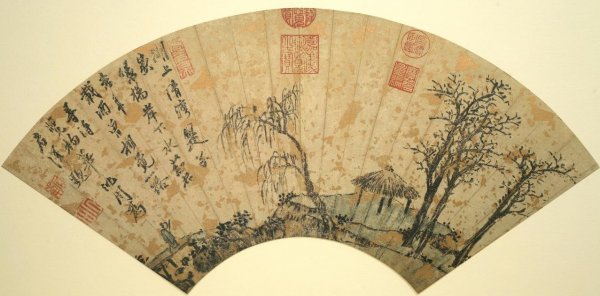 沈周《疏林亭子》:此作约为沈周65岁前的作品,图中坡头有一亭,亭左为一株枯柳,右为枯树三株,墨虽不浓,枝却挺拔有力。布局上,三株枯树二株相倚,使树间产生变化。左边一高士正策杖过石桥,欲绕林而过,虽然无远景,自觉景色无限,尽在不言中。苔点三五,以浓墨缀成,点于岩坡旁,顿觉分明。因扇地为洒金笺,不易着墨,故题句不甚清楚。诗为:“湖上清湾是子家,绿杨岸下水荭花,当年载酒会相觅,一路寻得览物华。”上款署君泽,诗意即叙去年来时情景,为君泽作时有所感而成。