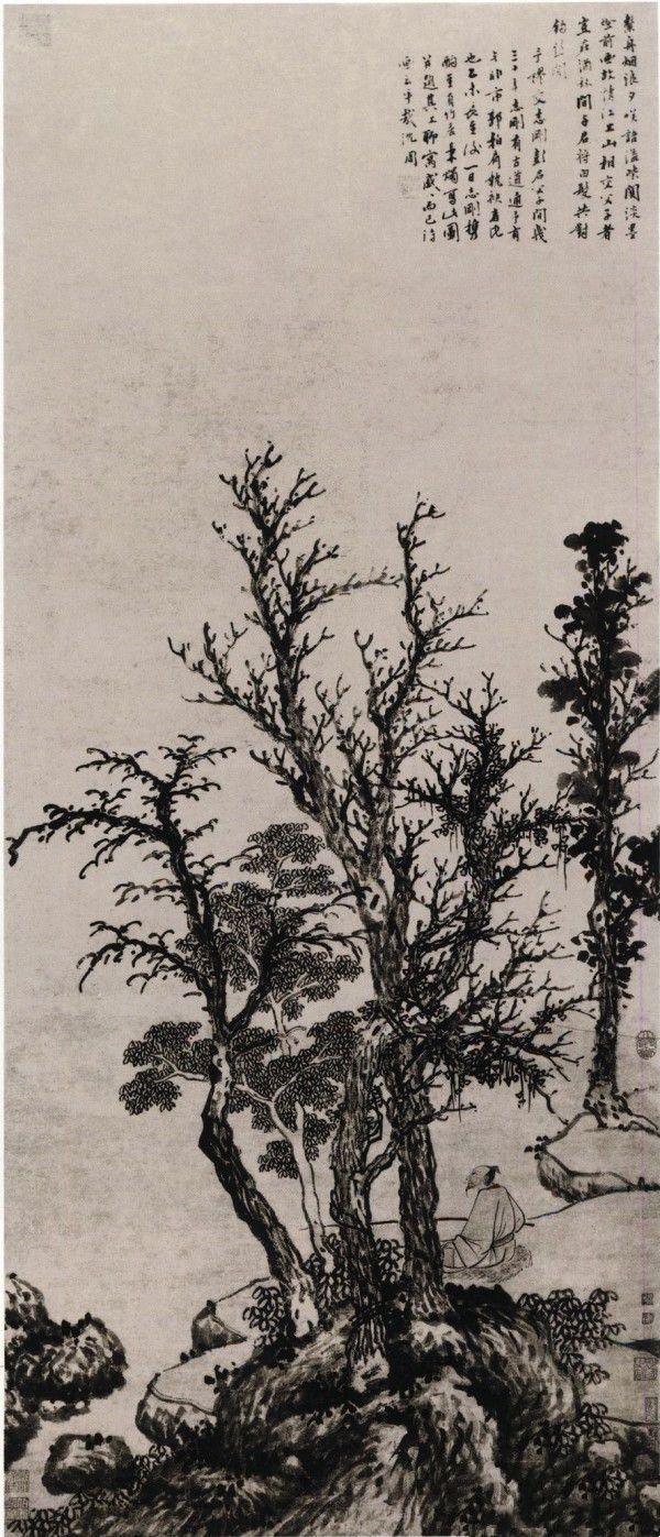 沈周《秋林静钓图》作品介绍:纸本,立轴,墨笔;纵152.5厘米,横62.8厘米;作于1475年;藏于美国大都会艺术博物馆。(注:此作于500年之后才有张大千的鉴藏印,故有人认为是后人摹本)