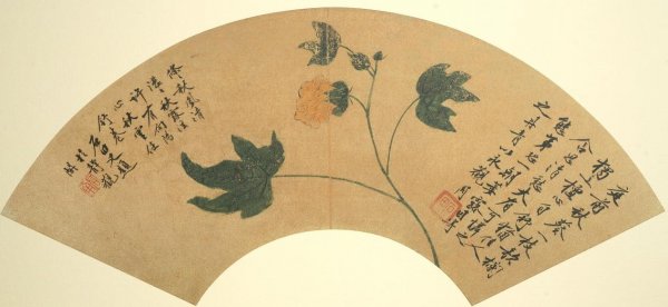 沈周《秋葵图》:此作采用没骨法写生法绘秋葵一枝,叶与干全用老绿一再渍染,因泥金地上有油质,本不托色,故笔迹重 ,锋芒都尽,布景不多,自有一种简秀朴质之韵。书法较晚年略觉软熟,可能是其五十至六十岁间的作品。作品左边题识:“庭前秋葵一枝。欹栏独立。檀心自舒。犹佳人含思清愁。大有可怜之态。第恐一朝萎露。因寄之丹青以永观。周”钤印“石田”。右边题识:“条条秋风清。湛湛秋露泫。许有向阳心。秋云任舒卷。石田又题于静观阁。” 钤印“启南”。