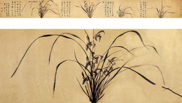 陈古白《墨兰图》作品介绍:绫本,墨笔;纵26.3厘米,横294厘米;藏于辽宁旅顺博物馆。