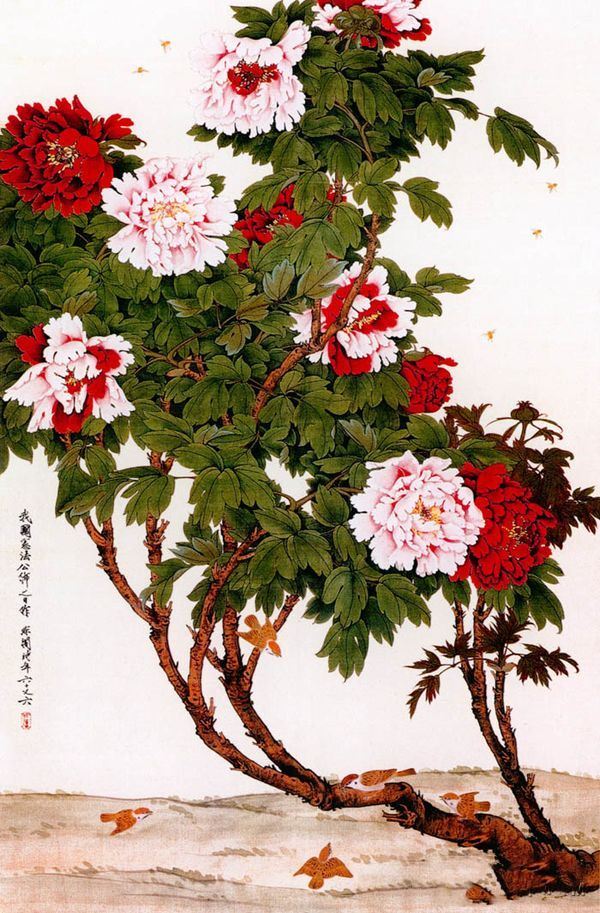 于非 《牡丹蜂雀》:于非 先生的这件作品创作于1954年我国宪法公布之日,表达他欢欣鼓舞的心境。作品主体是一株牡丹和几只小雀、数点蜜蜂。为把牡丹雍容华贵之姿表现出来,画家采用了低视点的表现手法,把地平线压得很低,整个背景不画一物,用一片纯净来衬托风姿绰约的牡丹。牡丹枝干遒劲,在碧叶繁茂中花朵盛开,数点蜜蜂忙忙碌碌,围着花朵转来转去,四只小雀在枝干间嬉戏。在画家精心的经营中,欣欣向荣的富贵之气溢满画面。