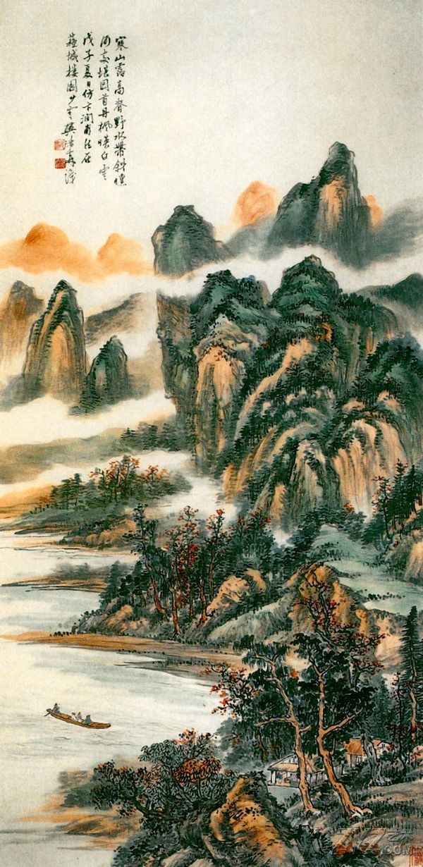 《野水带斜曛》作品介绍:1948年,纸本设色,136cm×67cm。朵云轩藏。