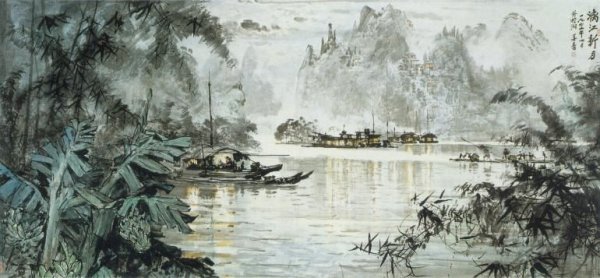 【漓江新月】作品介绍:1992年,纸本设色,160cm x 350cm。私人藏。