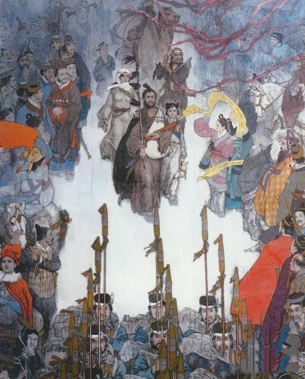 林凡《张骞回京》:林凡先生的这按作品取材于著名的历史典故“张骞出使西域”。作品描绘的是张骞完成使命回京复命的场景。图中,张骞衣衫虽然破旧,但脸上却充满着自信,大步而归,京城的人民对他夹道欢迎。画家采用环行构图,以突出中心人物张骞,刻画了他的英雄气慨和历经的磨难。图中张骞手执出使节杖,挽着一个小小的行包,昂首行走在京城的大道上。细观图中人物神态,我们可见人们发自内心地在为张骞喝彩,也可见到庸人们嫉妒的眼神。显然,画家在这里反映了一种社会现实和世俗现象.当然突出的是画中主题。大丈夫理当建功立业的雄心仕志。