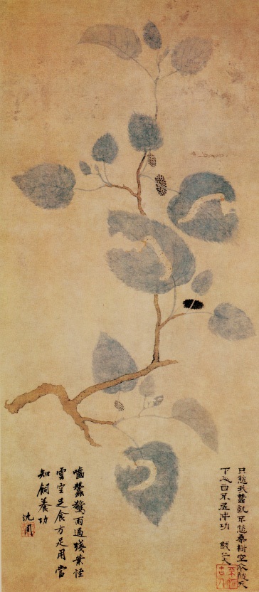 《蚕桑图》作品欣赏 明 孙艾 作者: 时间:08-31 浏览: 错误报告 蚕桑图 明 孙艾 此图画桑树干一枝,桑叶上有几条蚕正在取食桑叶。桑叶用没骨法,以花青画叶面,花青略加赭石画叶背,枝干先勾勒后填赭石。风格清疏淡雅。 延伸阅读: 陈芹《修篁文石图》_陈芹国画作品_陈芹国画_明郭诩《杂画图》_郭诩国画作品_郭诩国画_明《卓冠群芳图》作品欣赏 明 王谦沈周的《辛夷墨菜图》作品《芦雁图》作品欣赏 明 林良《秋林聚禽图》作品 明 林良《古木寒鸦图》作品- 明 周文靖夏杲《修筠拳石图》_夏杲国画作品_明夏昶的《清风高节图》作品夏昶的《戛玉秋声图》作品 明 标签:作品 上一篇:刘文西的《知心话》作品 下一篇:杨德树的《特使西行图》作品 最新文章推荐 约翰·克里斯蒂安·达尔(Johan Chri 朱利安·杜佩(Julien Dupré)作品-Ha 弗雷德里克·埃德温·丘奇(Frederic 克洛德·莫奈(Claude Monet)高清作品 克洛德·莫奈(Claude Monet)作品《戴 清 王翚《良常山馆图》 纸本高清作 留言与评论(共有 条评论) 验证码: