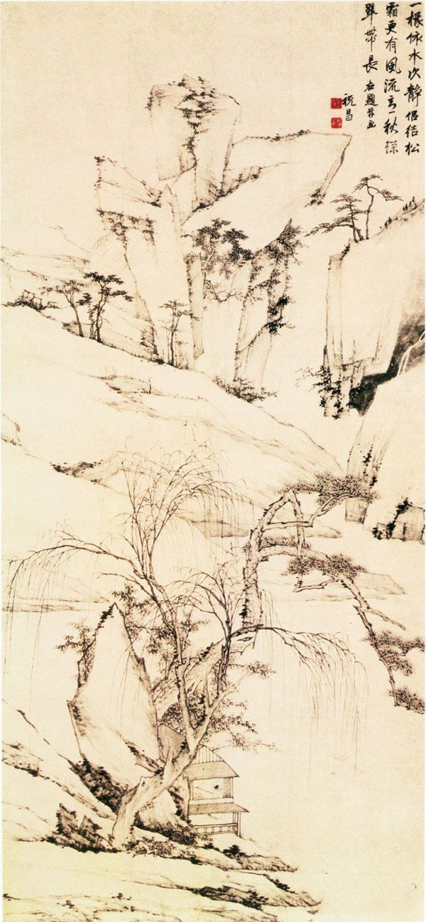 祝昌《水阁深秋图》:祝昌的这件作品描绘的是秋景,作品中山石浑厚险峻,从横交错,石上无土,杂树从石缝间生出,右面山坳处飞瀑急湍。近处坡坨平迤,巨石矗立,柳树枝条舒展,古松倒垂,水阁临江而建,阁中一人凭栏远眺,景极清幽。用笔瘦劲,皴法简淡,给人以明净空灵之感。作品上面为他自己的题识:“一椽依木次,静侣结松霜。更有风流亭,秋深翠带衣”。