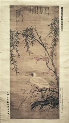 《花柳图》现藏中国美术馆,纵111厘米,横47.5厘米,绢本,设色。右上角题款:“横波夫人花柳画幅”。画面上一只白色水鸟,站立在一株盛开的桃花枝头,一棵垂柳,与粉红的桃花相依相衬。桃花艳艳,柳叶簇簇,俨然已是仲春时节。整幅画作,给人一种软媚艳丽的感觉,缺乏积极进取的风骨。这也难怪,以顾眉的闺阁、名妓身份,她的画风,自然难脱香艳绵软的风格。