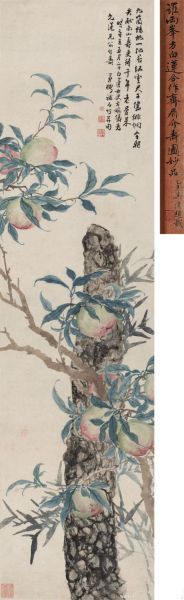 画面主角是方婉仪所绘的一株倾斜欹侧的桃枝,枝上硕果累累,挂满桃实。桃是福寿吉祥的象征,人们认为桃子是仙家的果实,吃了可以长寿,故桃又有仙桃、寿果的美称,象征健康长寿。画家多画此贺寿。画中桃树以没骨写意笔法画出,以石绿和暗红画桃实,以花青、赭色画叶子和枝干,画风清新秀丽。竹石为罗聘所补,石头以淡墨染就,再用墨线勾画上面的孔洞,竹子用花青以没骨写意笔法画出。