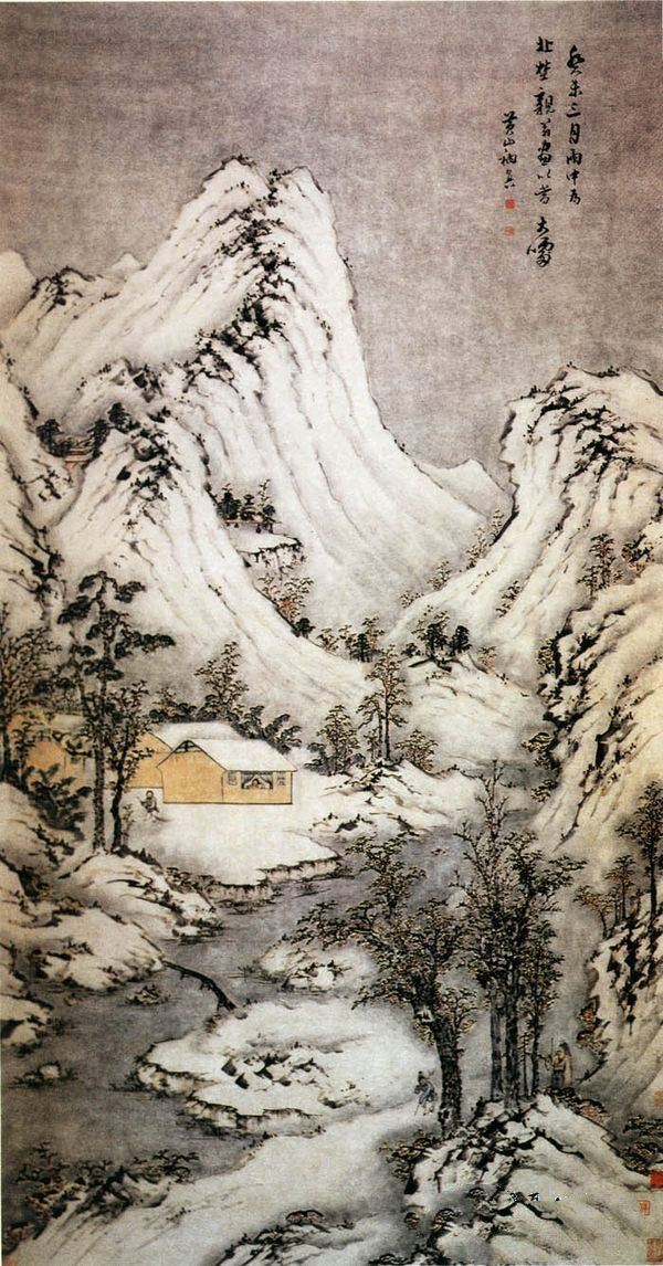 法若真《雪室读书图》:此作描绘的是寒冬之景,白雪皑皑,雪峰对峙,山溪斜流,坡前茅舍数间,一人凭窗,一童执帚,冈峦屋侧杂植松梅竹丛,丹枫绿树。溪侧二人踏雪出行,似寻梅访友。以淡墨染地,烘托雪景;勾点豪纵,敷染清雅;树石多用侧锋。