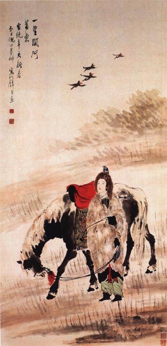 倪田作品《昭君出塞图》:王昭君是中国古代"四大美女"之一,“昭君出塞”的典故更是令人耳熟能详。这个典故也成为了许多艺术家的创作的源泉。不过很多作品描绘的都是昭君出塞时的场景。倪田的这件作品不同,他表现的是王昭君的思乡之情。画面景色肃杀枯败,塞外深秋,寒气袭人。一身胡服穿戴的昭君,一手执马鞭,一手执缰绳,似刚下马背。空中几只南归的大雁吸引了她的目光,让她不觉黯然神伤,萌生故国千里、归期如梦之感。画家较少用线条钩勒,以墨彩直接渲染。师法任伯年的小写意人物画,却又独具一格,笔法更为自由,写中带工,收敛自如。背景以淡彩渲染烘托,以红、绿、黑等重色为主调,形成较为强烈的视觉效果。笔不显而意满,景不实而韵足,格调清新雅致,是倪田的代表作品之一。作品中有作者的自题字:“一望关河萧索。”更是增强了作品的意境。