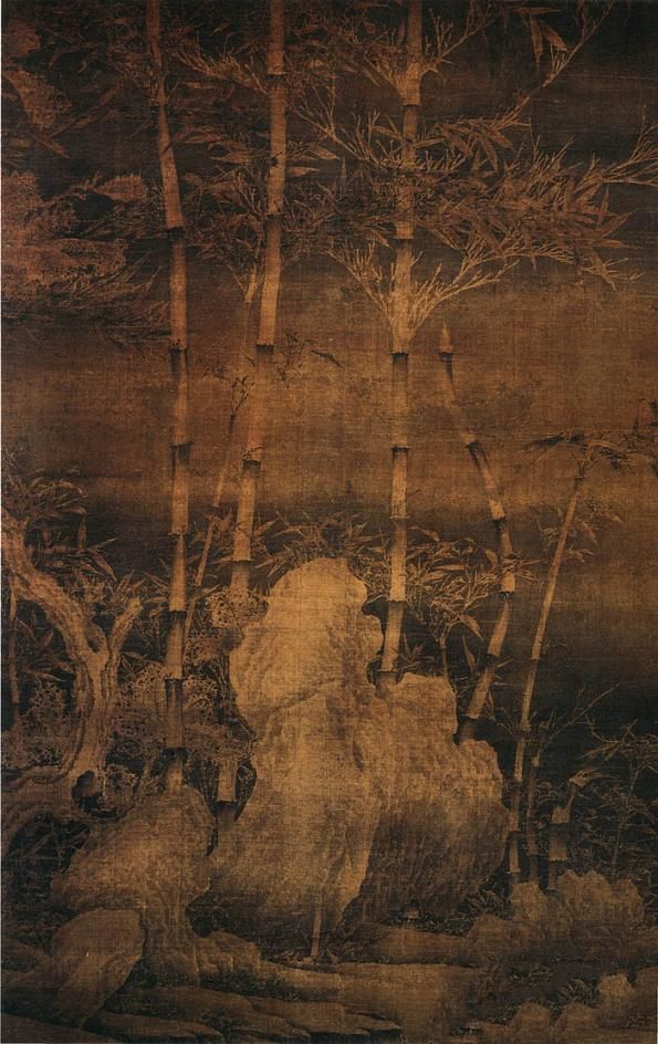 《雪竹图》:在这件作品中作者采用用烘晕皴擦等法,描绘竹石覆雪的景象,构图新颖,层次丰富。石后三竿粗竹挺拔苍劲。其旁有弯曲和折断了的竹竿,又有一些细嫩丛杂的小竹参差其间,更觉情趣盎然、生机勃勃。竹节用墨皴擦,结构清楚。竹叶用细笔勾描,正反向背,各逞其势。地面秀石不勾轮廓,只用晕染方法衬出,以示其雪。此图无款识。画中大石右侧的竹竿上,有篆书体倒写“此竹价重黄金百两”八字。此画以线条墨色为主,工整精微而写实,为五代的佳作。