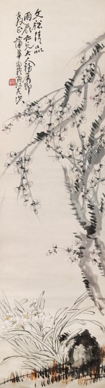 梅花、水仙为冬季文人所喜之清品,此画以水墨、白描双勾表现此二种花卉,水仙向左上舒展,梅花自右侧出枝后向上生发,而后折回向左下,与水仙相呼应,构图呈合抱之势。此画在蒲华作品中属于比较秀润的一路。