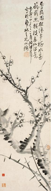 北宋诗人林逋(字和靖)最喜梅花与鹤,有“梅妻鹤子”之称,并有多首咏梅诗流传于世。此画即画其诗意。梅枝从右下角发枝,用笔挺劲,墨色清透,很好地表现了梅花“清”“劲”的品格。