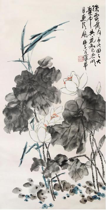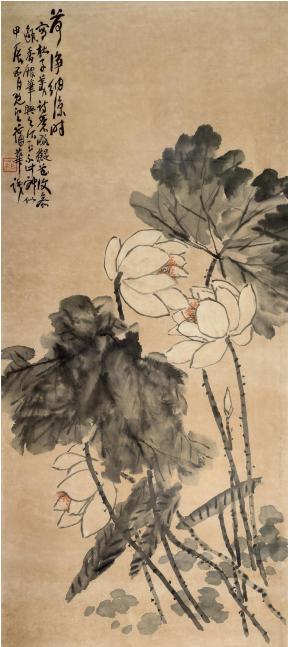 蒲华曾以“荷净纳凉时”为题画过山水,这则是一幅以此为题的花鸟画。画家特意画白色荷花突出一个“净”字,一正一反两片大荷叶用破墨的方法使得效果丰富淋漓,其自题是糅和了陈道复和恽南田的笔墨设色法。