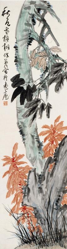 “秋色老梧桐”系李白诗《秋登宣城谢眺北楼》中的一句,此图即画此诗意,画面中能体现秋色的,除了结籽的老梧桐树外,就是下方朱红色的雁来红了。雁来红又名老少年,也是文人喜画的秋天花卉题材。