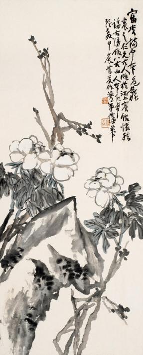 “神仙队里风流易,富贵场中本色难”是晚清洋务派大臣、清官沈葆侦所撰的联句,是他坦荡一生的写照。沈与蒲华为同时代人,为蒲华所钦佩,故而画家以此句为题来作画,为体现“本色”,特意将牡丹花画成白色以示清白之意。