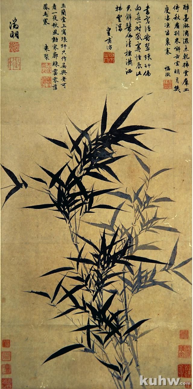 竹常被文人高士用来表现清高脱俗的情趣:正直的气节、虚心的内在和纯洁的思想感情,因此墨竹成为书画道(哲学)的综合载体,成为人格、人品的直接写照。文徵明兼善山水、兰竹、人物、花卉诸科,尤精山水,早年师沈周,后致力于赵孟、王蒙、吴镇三家,自成一格。其画风呈粗、细两种风貌:粗笔之笔墨苍劲淋漓,于粗简中又见层次和韵味;细笔布景繁密,较少空间纵深,造型规整,时见棱角与变形,用笔细密,于精熟中见稚拙。设色多青绿重彩,于鲜丽中见清雅。这路细笔山水属本色画,奠定了“吴派”的基本特色。