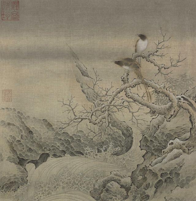 图绘山间冬季景色,天阴欲雪,霜柯临水,柯下溪涧奔流,水花飞溅,远处竹林葱茏。两只山鸟栖于枝头,眺望远方,将观赏者的目光引向画外,从而收到画尽而意无穷的艺术效果。图中老柯、丛竹用笔刚劲,水花、鸟羽笔触轻柔,流水奔腾不息,山石巍峨不动,使画面形成刚柔相济、动静对比的艺术效果。