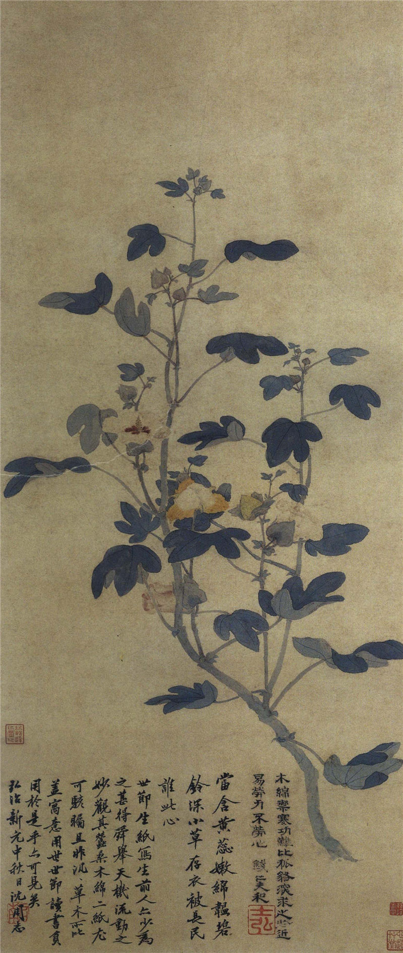 孙艾 木棉图轴 明 作者:admin 时间:08-31 浏览: 错误报告 孙艾 木棉图轴 明 孙艾,生卒年不详,江苏常熟人。工绘事,山水宗黄公望、王蒙,花卉学钱选。传世作品有《木棉图》、《蚕桑图》。此幅画木棉花一枝,枝干劲挺,花苞开放,叶以花青画成,以没骨法浓色为面 ,淡色为背,笔法秀逸,有元代钱选之风格。 延伸阅读: 陈芹《修篁文石图》_陈芹国画作品_陈芹国画_明郭诩《杂画图》_郭诩国画作品_郭诩国画_明《卓冠群芳图》作品欣赏 明 王谦沈周的《辛夷墨菜图》作品《芦雁图》作品欣赏 明 林良《秋林聚禽图》作品 明 林良《古木寒鸦图》作品- 明 周文靖夏杲《修筠拳石图》_夏杲国画作品_明夏昶的《清风高节图》作品夏昶的《戛玉秋声图》作品 明 标签:作品 上一篇:宋·佚名 归牧图 作品欣赏 下一篇:孙克弘 花鸟图册(之七、之八) 明 最新文章推荐 约翰·克里斯蒂安·达尔(Johan Chri 朱利安·杜佩(Julien Dupré)作品-Ha 弗雷德里克·埃德温·丘奇(Frederic 神坂雪佳(Kamisaka Sekka,日本画家) 路易斯-让-弗朗索瓦·拉格尼(Louis- 弗朗索瓦·布歇(François Boucher) 留言与评论(共有 条评论) 验证码: