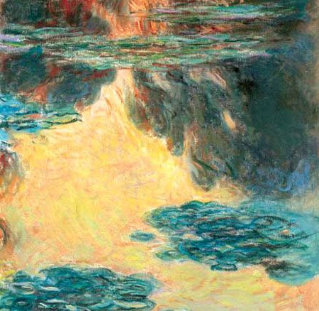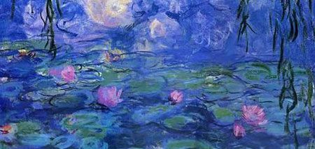 印象派是19世纪法国最重要的画派,是西方绘画告别传统进入现代的标志。印象派这个名称得自于法国画家克劳德·莫奈(1840---1926)的作品《日出印象》,该作表现了日光在多雾早晨的美妙景象,用短促而有些零乱的笔法表现了雾气朦胧的意境,被当时保守的批评家嘲笑为“印象派”。莫奈是一个外省来的青年画家,在巴黎,他生活窘迫,艺术上受到主流的排斥,但是他顽强地坚持着,组织了印象派画家的多次展览,随着时间的延续他们逐渐得到了社会的承认。中年以后的莫奈在绘画上有了市场,经济状况大为好转。于是他在巴黎郊外的吉维尼村建造了一个人工的池塘,并引入河水,形成一个水上的花园。莫奈还在池塘周围种植了各种垂柳和花卉,在池塘里则繁殖了大量睡莲。在午后的阳光下,如镜子般的水面上,睡莲飘浮,这些异常的水生植物,大叶子向外平摊开来,和令人神往的花朵奇怪地移动着,西方的色彩、光线和东方的诗意情调在这里巧妙地交汇在一起。晚年的莫奈几乎将所有的精力都投入到了有关睡莲的创作当中去了。