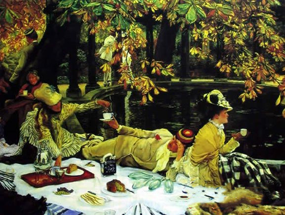 雅姆・蒂索《消闲(草地上的午餐)》 画家以学院派手法,加上印象派外光画法,描绘了草地上消闲的绅士淑女。画家以幽暗的树林为背景,衬托了前景白布上的男人、女人及食品,体现了一种消闲的安适心态。后面的人各具姿态,融入背景。背景中阳光照耀下的几枝黄叶,不仅点明秋天的季节,也平添了画面的颜色,增加了热烈的气氛。景物、人物都描绘得极其细致,外光的运用,给画面带来了色彩斑斓与豪华亮丽的效果。