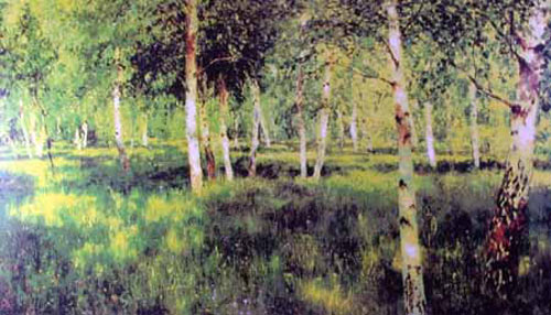 I.I.列维坦《白桦丛》 19世纪俄罗斯的批判现实主义艺术,在风景画方面,列维坦是重要代表人物之一。他的作品洋溢着爱国主义精神,且情调细腻、情景交融、诗意盎然,充满着民族主义的思想感情。《白桦丛》便是这样的风景画,画家以抒情的手法,诗意地展示了白桦林那无可替代的魅力,让人从中得到美的享受,领略自然的原生态之美。