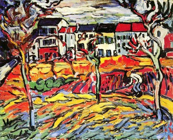 莫里斯・德・弗拉芒克 《夏都的住宅》 莫里斯・德・弗拉芒克 《夏都的住宅》在色彩特点上是把各种强烈的原色调入青绿色调之中,把各种物象――房屋、树木、花圃与道路,表现为形象的颠覆和色彩的疯狂。颤栗的线条更加剧了动荡感,仿佛画面中流露出的是节奏变换的狂乱意绪,创造着 一种令人兴奋的野兽派画风。 《夏都的住宅》弗拉芒克具有叛逆的气质,他曾自豪地宣称从未被局限于卢浮宫之内,而且他想以他的钴蓝、橄榄绿和朱红色把美术学院燃烧殆尽。他喜欢用锡管里直接挤出来的明亮的色彩,把鲜红色与纯橘色结合起来,并以鲜明的蓝色和绿色来使色彩更为强烈,他的画和凡・高一样在燃烧。