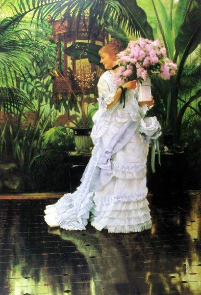 雅姆・蒂索作品《丁香花束》 雅姆・蒂索作品《丁香花束》这是一幅色调优美、充满浪漫气息的油画。在绿色植物构成的背景前,身着白色长裙的女孩,手捧丁香花瓶,亭亭玉立。白色的长裙与繁茂的丁香花朵交相辉映,丁香花香溢满画面,使画面充满诗意与浪漫情调。
