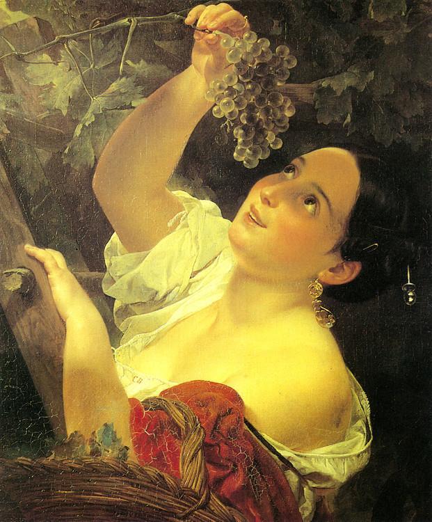 布留洛夫《意大利的中午》:这件作品是布留洛夫最优秀的代表作品之一,此作与他1823年创作的《意大利的早晨》,被认为是他意大利时期的两幅姐妹作。这件作品描绘的是一个风韵十足的女郎正在摘葡萄,娇美的面部、浑圆而柔美的手臂与肩膀,增添了作品的魅力。布留洛夫的这件作品,体现出他力求摆脱古典主义束缚,用较多浪漫主义的因素,来表达不可遏制的浪漫激情与艺术理想。