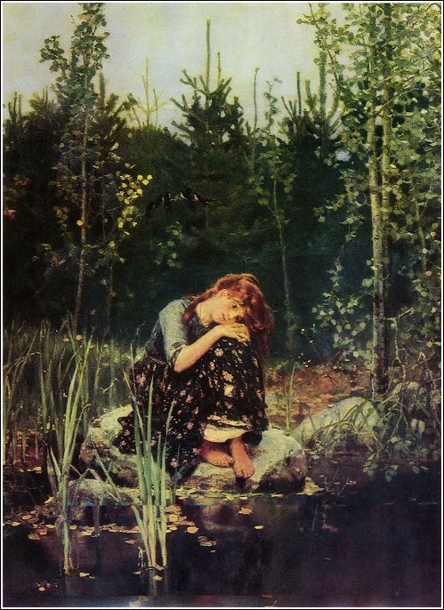 《阿廖努什卡》:V·M·瓦斯涅佐是俄罗斯著名的艺术家,他专攻神化和历史题材,早期作品多表现小市民生活。迁居莫斯科后开始以传说 、民间故事为题材创作油画。这件《阿廖努什卡》便是取材于俄罗斯民间故事:传说阿廖努什卡是一个质朴善良又美丽的姑娘,失去了父母成了孤儿。她从小就饱尝了人世间的不公和悲哀,后来由于女巫的捉弄,使她失去了弟弟,又离开了自己的恋人。作品中V·M·瓦斯涅佐把阿廖努什卡置于密林深处的池塘边,她坐在塘边的石头上,卷曲着身体,抱膝陷入沉思,眼里充满着悲伤与无奈。阿廖努什卡的不幸与周围自然景色构成充满悲悯的诗意。她蜷曲的姿态和冲向天际的林木互相映衬,显得格外真实感人,令人产生无限的遐想。