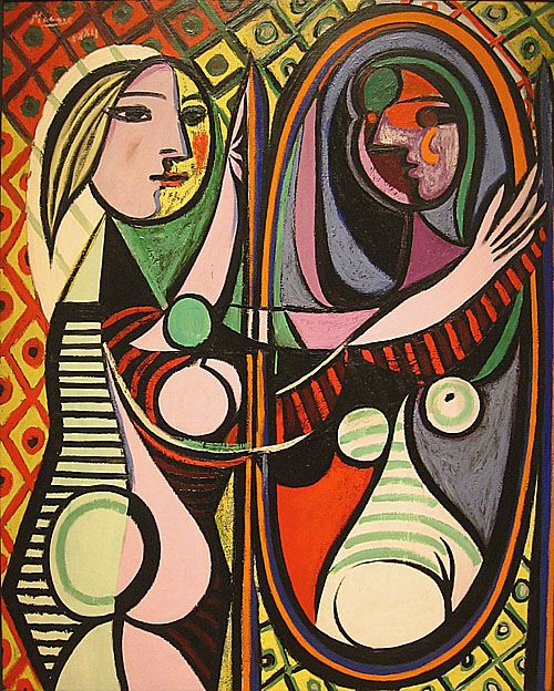 毕加索《镜子前的女孩》简介:外文名Girl before a Mirror;画布,油彩Oil on canvas;纵162.3厘米,横130.2厘米;作于1932 年;藏于美国纽约市现代艺术博物馆 Museum of Modern Art (MOMA), New York City。