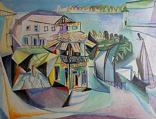 毕加索《鲁瓦扬的咖啡馆》简介:外文名Cafe de Royan;画布,油彩Oil on canvas;纵38厘米,横45.7厘米;作于1939年;藏于私人收藏 private collection。
