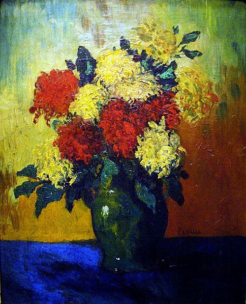 毕加索《菊花》简介:外文名Chrysanthemums;画布,油彩Oil on canvas;纵81.1厘米,横65.1厘米;作于1901年;藏于美国宾州费城艺术博物馆 Philadelphia Museum of Art。