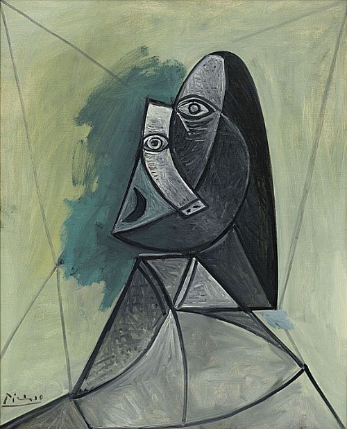 毕加索《女子胸像》简介:外文名Buste de Femme;画布,油彩Oil on canvas;纵104.7厘米,横85.9厘米;作于1943年;藏于 荷兰凡阿贝市立博物馆 Stedelijk Van Ae Museum。