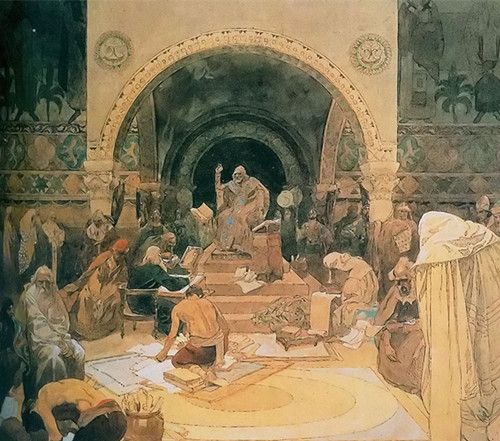 阿尔丰斯·穆夏简介:阿尔丰斯·穆夏,1860年7月24日生于原捷克斯洛代克共和国(现捷克共和国)的南摩洛维亚省伊梵尼切市,卒于1939年7月14日。从斯拉夫史前一直到1 9世纪末漫长的历史再现,使人们更加深刻地了解了画家的内心世界。从画面的宏伟和动人的表现,又使人们可以感受到作为艺术家,他过人的绘画技巧和才能。从他为自己国家所做的一文不取,不遗余力的奉献,那些从邮票到警察制服,从纸币到国徽,无不倾注了他的心血。作为一个虔诚的斯拉夫宗教信仰者,他又为布拉格的圣维塔大教堂、苏斯大教堂无偿地创制了彩色玻璃窗装饰画和大型壁画。他把自己的艺术和生命奉献给了自己的祖国和民族。他不仅曾是一名新艺术时期的代表,更是一个对祖国无比热爱的伟大的历史画家。