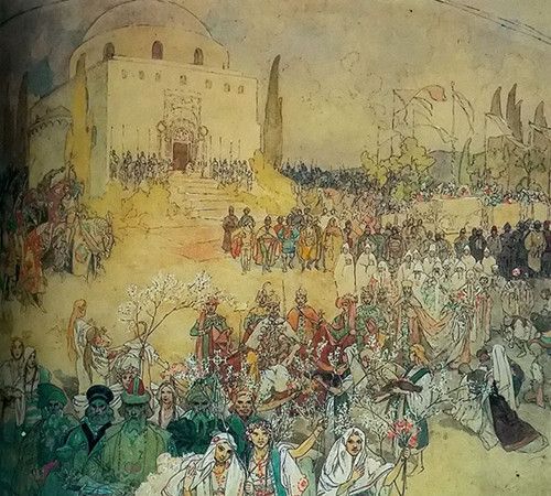 阿尔丰斯·穆夏【东罗马皇帝即位习作】简介:作品尺寸:44x39 作品年代:1926 作品材质:纸面钢笔, 墨水, 水彩画 pen, ink and watercolour on paper 现收藏于:不详