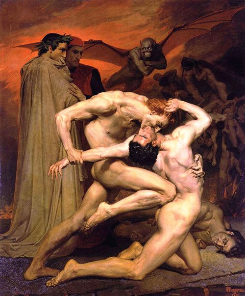布格罗【但丁与维吉尔在地狱中】简介:作品尺寸:225x281 作品年代:1850 作品材质:布面油画 oil on canvas 现收藏于:不详布格罗【但丁与维吉尔在地狱中】:《但丁与维吉尔在地狱中》,这幅画的主题取自于《神曲》中所描绘的,但丁被维吉尔邀请一起游览地狱的场景(左边的2个路人才是但丁与维吉尔,头戴橄榄枝环的是但丁)。要想这幅画,首先得知道3个人。但丁作为13世纪最具神话特色的诗人,但生平的相关记录却很少,他因主张自由而反对教皇,被教会流放。但是他却成为了封建中世纪向现代资本主义过渡的开端。有句人人都知道的名言“走自己的路让别人说去吧”就是出自但丁之口。维吉尔是公元前70年到19年罗马最伟大的诗人,因为年代久远,所以记录很少,但丁和他时隔1300年,但但丁却视他为老师。威廉·阿道夫·布格罗,是法国唯美主义画派大师,所描绘的内容,以寓言、神话、爱情为主,喜欢以宁静,幸福理想化来表现。这幅画却一改布格罗作画常规,以狂烈,鲜明的色彩,来表现地狱的七宗罪&mdashmdash;傲慢、妒忌、暴怒、懒惰、贪婪、贪食及色欲。在画面最中心的位置,是2名互相厮打的罪人,其中一人抓住另一人的侧腹,并撕咬他的喉咙,这说的是暴怒。紧接着他们后面,是一名无力摊躺在地上的人,他漠视眼前发生的一切,这说的是懒惰。而更远处,的人群,分别描绘了傲慢、妒忌、贪婪、贪食和色欲。布格罗这幅《但丁与维吉尔在地狱中》,一改以往柔美的人体,将肌肉画得相当详细,动作刻画得相当夸张,要数布格罗生涯中最有张力的画面之一。地狱中的罪人,表情痛苦狰狞,为他们生前犯下的罪孽赎罪,而但丁和维吉尔在一旁默默地看着,维吉尔一只手挡在但丁身前,意为不要去干涉他们。布格罗将心中的七宗罪用这种方式排列了顺序,最忌讳暴怒,然后是懒惰,这也正符合布格罗的性格。以平静的心态对待生活,以勤奋的心态对待艺术。所以在他的大部分作品中,主题往往都是轻松自然,宁静而欢快的。如果说布格罗的一生是一幅画的话,那么《但丁与维吉尔在地狱中》这幅画就是布格罗人生之画的最重要的对比色,它既是布格罗也是反布格罗。