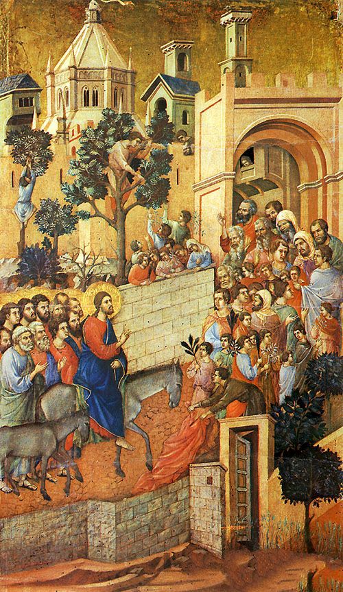 杜奇欧《基督进入耶路撒冷》作品介绍:外文名Entry into Jerusalem;画板,蛋彩tempera on panel;纵100厘米,横57厘米;作于1308 - 1311年;藏于意大利西艾那大教堂。