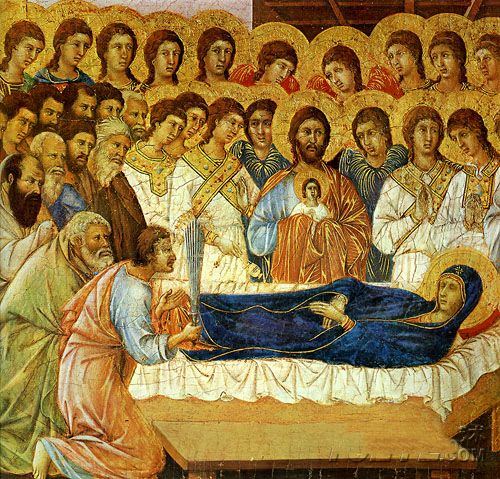 杜奇欧《圣母之死》作品介绍:外文名Death of the Virgin;画板,蛋彩tempera on panel;纵40厘米,横45.5厘米;作于1308 - 1311年;藏于意大利西艾那大教堂。