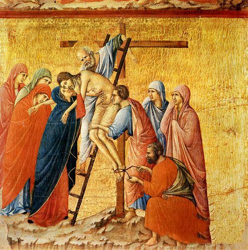 杜奇欧《基督被解下十字架》作品介绍:外文名 Deposition;木板,蛋彩tempera on wood;纵50.5厘米,横53.5厘米;作于1308 - 1311年;藏于意大利西艾那大教堂。