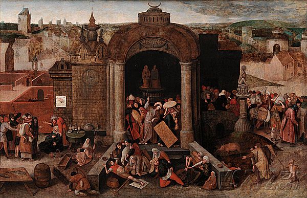 勃鲁盖尔《驱逐商人》作品介绍:外文名Christ Driving the Traders from the Temple;画板、油彩oil on panel;纵102厘米,横155.5厘米;作于1569年;藏于丹麦哥本哈根国立美术馆 Statens Museum for Kunst。