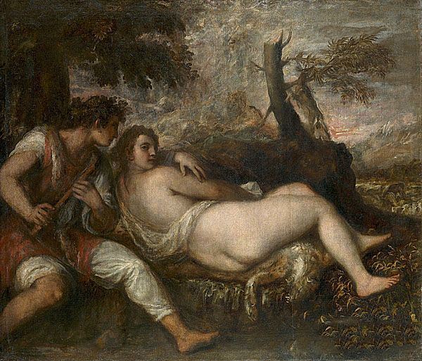 提香《女神与牧羊人》作品介绍:外文名Nymph and Shepherd;画布,油彩Oil on canvas;纵149.6厘米,横187厘米;作于 1570 - 1575 年;藏于奥地利维也纳市艺术史博物馆 Kunsthistorisches Museum, Vienna。