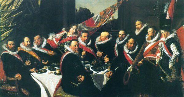 哈尔斯《圣乔治城守卫军官的宴会》:这件作品是哈尔斯第一幅引起轰动的群像,当然人物略显拘谨、呆板,不过在他以后的群像中就显示出更多的轻松活泼的气氛。作品以宴会的形式将众多的人物组合在一起,尽量降低由于透视而产生的远近空间形象差异,使每个人尽量显示出自己的全貌和个性姿态,除前面两个人物较突出外,其余形象大小基本相似。画面的明暗和色彩关系也必须服从于平等原则,深暗背景环境中的人物,其头部和手部也须鲜明,画中军旗配饰和佩剑有助于表现人物的地位和身份,所以画家也作了精到的描绘。此画从一个侧面表现了荷兰独立战争中的战士们的英武形象,而主要是描绘画中人物各自的面貌和个性。
