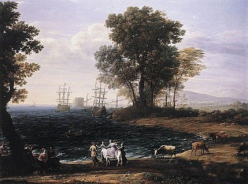 洛兰作品介绍:全名克劳德·洛兰,外文名Claude Lorrain,生于1600年,卒于1682年,法国著名风景画画家。他出生于法国东北部农村,曾做过食品工人,但其一生大部分时间也在意大利度过,克劳德·洛兰终生醉心于海景和意大利风景,克劳德·洛兰对罗马那些有古代遗迹的景色进行过大量的研究的描绘。普桑在风景画中追求哲理性,而洛兰却追求的是抒情的气氛。普桑作品中更多的是清晰、明朗和宁静,洛兰作品却常常显露出雾气迷蒙,光色炫目的效果。他的风景画是理想与梦幻的世界,是一种人为美化的景色,它唤起人们向往美好的情感。后来欧洲人常常以洛兰描绘的理想化风景为标准,寻找或布置洛兰式的风景园林。