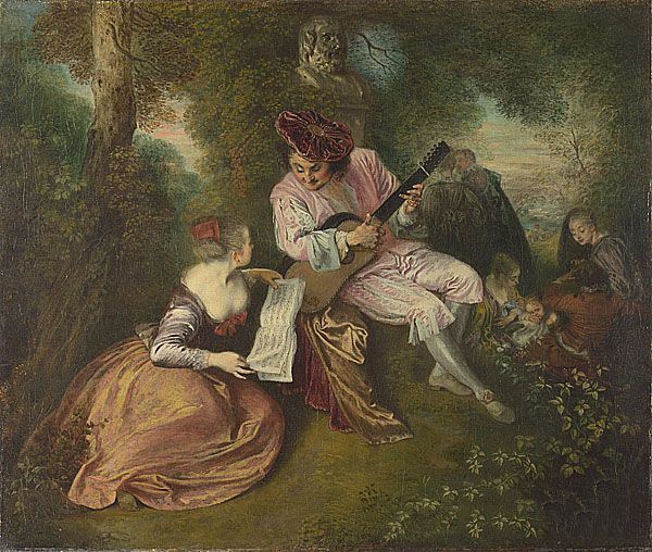 华多《爱之歌》作品介绍:外文名The Scale of Love;画布,油彩Oil on canvas;纵50.8厘米,横59.7厘米;作于1715 - 1718 年;藏于英国伦敦国家画廊 National Gallery, London