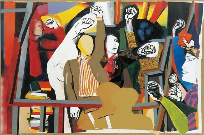 这是一幅大型拼贴画,由纸屑、张贴画、画刊剪报、五颜六色的胶条、塑料条、色彩涂块拼贴而成。画家用这些原料绘制成一个学生法庭。被告席上站着一群人,他们高举手臂、紧握拳头,其中正中间的那个人上衣上别着象征共产主义的镰刀锤头徽章。这群人脸上写满必胜的信心,并赢得了站在画面右侧的听众的赞许与支持。这些听众用拳头、红色的党章和玫瑰花来表现爱和勇气。画面的左侧有一堆书,暗示被告是有丰富知识的学生。被告席由木栏杆围着,将这群人同另外两个只刻画简单轮廓的人分开。从衣服的颜色以及他们左肩上的白色胶条可以隐约分辨出这是两名士兵。作者赋予学生们富于表现力的鲜明色彩,与此相反,两名士兵则显得黯然失色,毫不起眼。古图索所描绘的审判,发生在米兰。这幅作品与他关于巴黎学生起义的画作《六八年五月墙报》天然成对。作品将表现主义、立体派、西西里民间艺术与流行艺术融为一体。