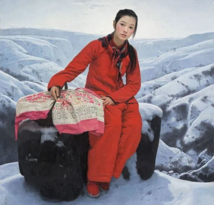 这幅画是王沂东创作的美丽乡村组画之三:迎春。表现了山东沂水姑娘在冰天雪地里对春天的渴望和憧憬。画面的颜色主要是白色、红色和黑色,这种颜色的组合容易产生强烈的视觉效果,在红白对比中,更加突显了红衣姑娘的主导位置。作者沂东先生是大陆油画家的领军人物,也是写实主义画派的中坚力量之一。他的作品一直坚守着乡村题材和民间趣味。从八十年代的《蒙山雨》到九十年代的《闹房》到2009的新作《美丽乡村一迎春》一直没有离开这一主题。他对乡村生活的向往其实是对纯粹精神的赞美,他对农民的热爱实际上是对民间色彩的情有独钟。