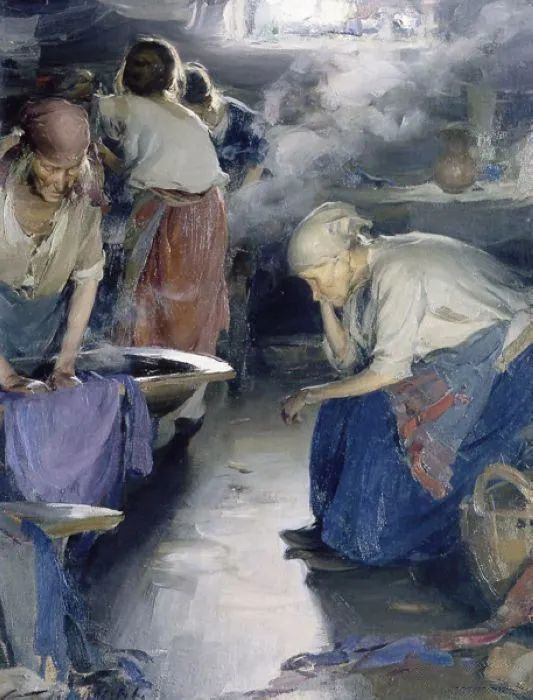 这幅画是阿尔希波夫的代表作,是俄罗斯艺术史上的杰作。原作共有两幅,藏于特列恰克夫博物馆的这幅作于19世纪90年代末,画面的主要人物是一位经受长年劳作而疲惫的老妇,在充满水蒸气的洗衣房中,还有几个妇女正在吃力地工作着。小窗中射进的一线阳光朦胧地显现出在雾气弥漫的环境中从事劳动的妇女身影。阿尔希波夫以浑厚的笔触,别具匠心的章法,含蓄而有表现力的银灰色,创造了令人难忘的艺术形象。这幅作品与夏尔丹的《洗衣妇》、米勒《洗衣妇》、德加的《熨衣妇》,都是世界美术史上不可多得的精品。